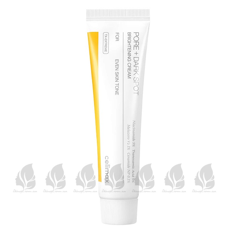 Крем Celimax Pore+Dark Spot Brightening Cream допомагає зменшити пігментацію, пост-акне, ластовиння, вирівнює тон шкіри. Він контролює виділення шкірного жиру, звужує пори, зволожує, пом'якшує та підвищує пружність шкіри. У складі 5% ніацинаміду, 5% транексамової кислоти, 1% рослинного комплексу Melazero, вітамін С, 5 церамідів (0,1%). pH рівень 6,1-8,1.