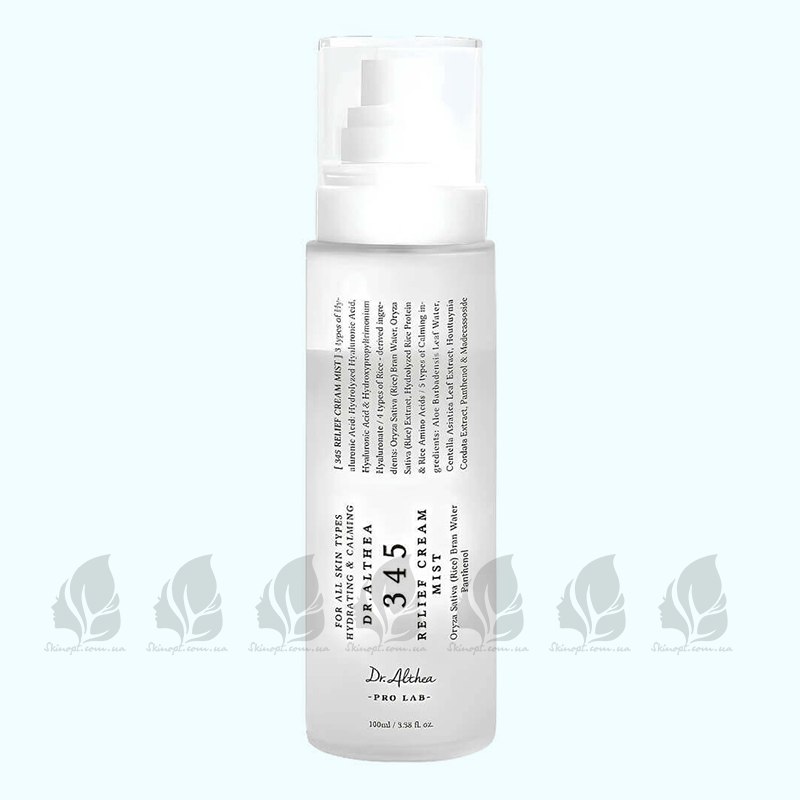 Dr.Althea 345 Relief Cream mist поєднує в собі властивості зволожуючого тоніка і ніжного крему. Його легка емульсійна текстура легко ковзає по шкірі, зволожує, заспокоює та зменшує почервоніння. Гідролат (60%), екстракт рису, протеїн і амінокислоти насичують шкіру вітамінами групи В і антиоксидантами, забезпечуючи інтенсивне зволоження, запобігаючи лущенню і підвищуючи еластичність. Пантенол (вітамін B5, 10000 ppm) сприяє загоєнню мікропошкоджень, пом'якшує, заспокоює та покращує бар'єрні функції шкіри.