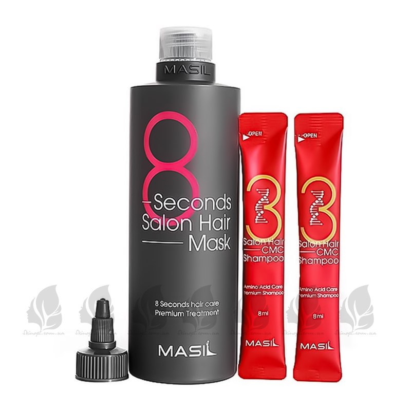 Комплекс Masil 8 Seconds Salon Hair Mask Special Set, що містить кератин і колаген, допомагає швидко позбутися сухості, ламкості та запобігти посіченню кінчиків волосся. Він зміцнює, робить м'яким і шовковистим, наповнює волосся вологою. Комплекс включає шампунь Masil 3 Salon Hair CMC Shampoo, який очищує шкіру голови і стимулює регенерацію клітин та волосяні фолікули, захищаючи від випадіння і лупи.