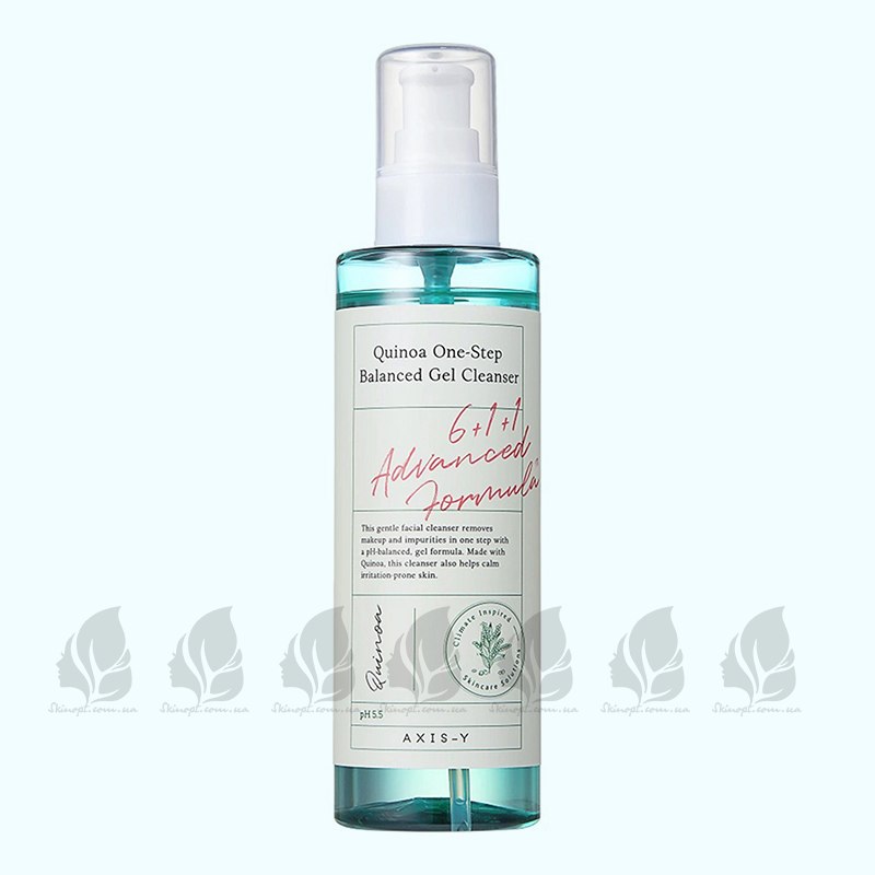 AXIS-Y Quinoa One Step Balanced Gel Cleanser — універсальний засіб для очищення обличчя. Видаляє макіяж, сонцезахисний крем, бруд і пил. Гель контролює надлишок шкірного сала, а також ніжно очищає шкіру, не порушуючи її природний баланс і рівень рН. Після використання шкіра залишається зволоженою і відчуває себе комфортно. Гель має антибактеріальну дію, заспокоює шкіру та сприяє загоєнню запалень.