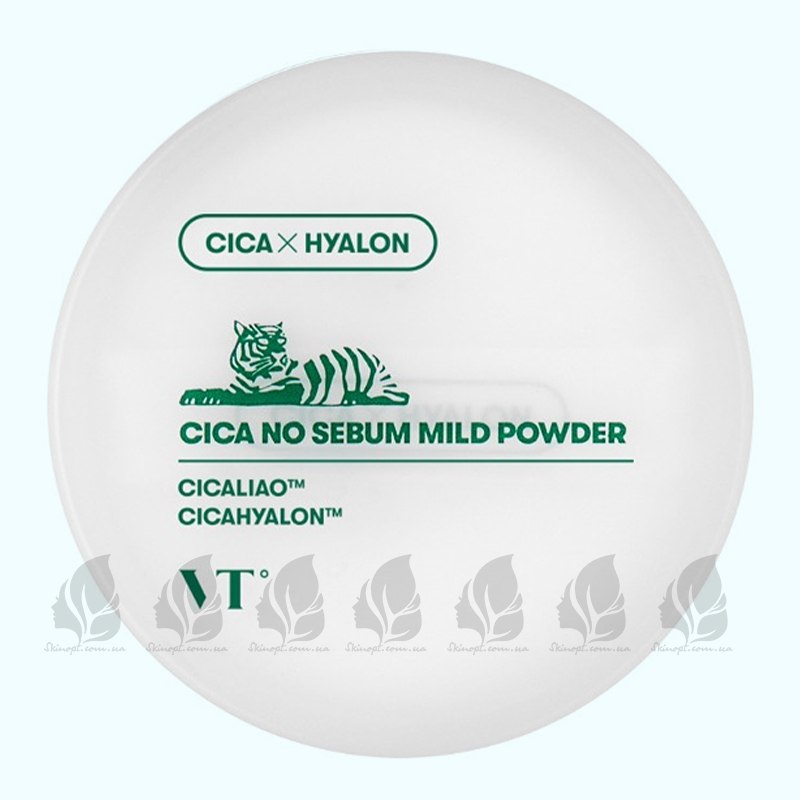 Пудра Cica No Sebum Mild Powder від VT Cosmetics із центелою контролює жирний блиск в області T-зони, нейтралізує надлишок сала, швидко освіжає макіяж. Вона заспокоює та пом'якшує шкіру, зменшує подразнення та почервоніння. З дрібним помелом, вона не підсилює лущення, відмінно поглинає вологу та жир. Склад містить Cicahyalon комплекс із центелою, прополісом, гіалуроновою кислотою, каламіном, церамідами, пантенолом, екстрактом календулі, токоферолом та кремнієм.