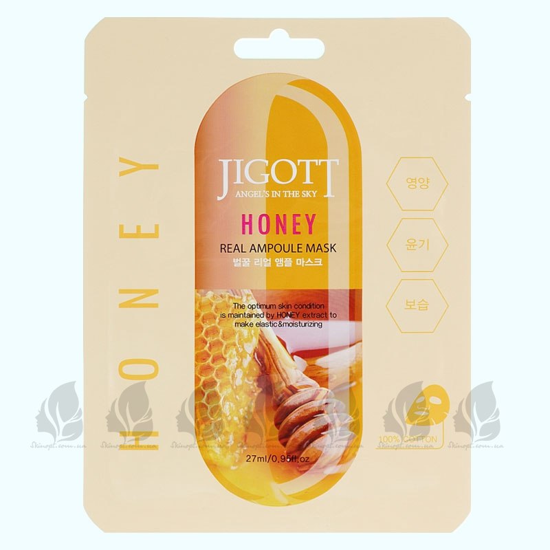 Ампульна маска для обличчя HONEY Real Ampoule Mask, JIGOTT з екстрактом меду призначена для наповнення шкіри цілющими компонентами. Засіб ефективно бореться із віковими змінами, вирівнює тон, розгладжує мікрорельєф, підтягує контури. Усуває сухість, лущення, пом'якшує, підтримує оптимальний рівень зволоженості. Повертає втрачену еластичність, пружність, гладкість та сяйво.