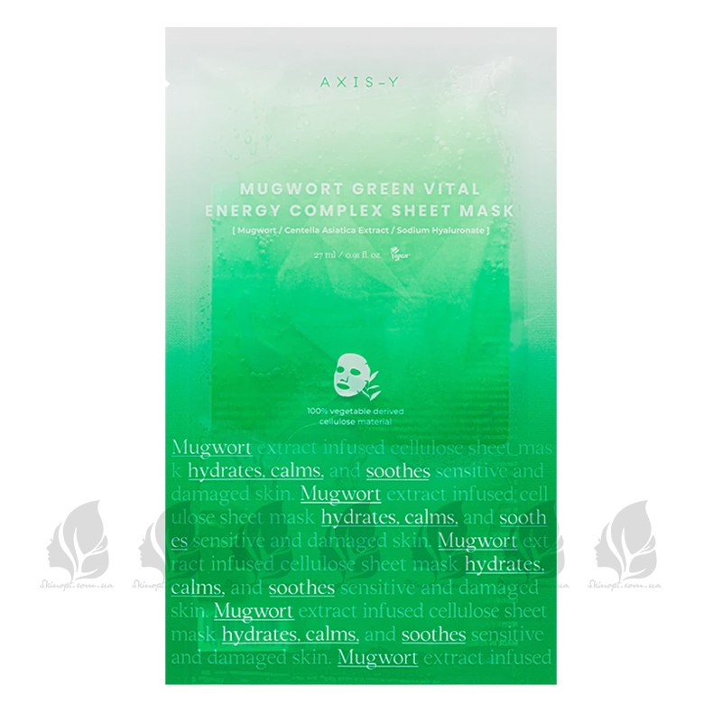 Заспокійлива тканинна маска від AXIS-Y зеленого Vital Energy Complex маскує і зволожує обличчя при застосуванні, зменшує почервоніння та подразнення. Розслабляє відчуття стягнутості, зменшує лущення, прискорює процес загоєння. Тонка тканинна основа з целюлози має щільний контакт з обличчям, що запобігає швидкому випаровуванню сироватки. Склад включає 61% екстракту полину, рослинний комплекс MultiEx BSASM®, алантоїн, гіалуронову кислоту, а також екстракти броколі, зеленого чаю та шпинату.